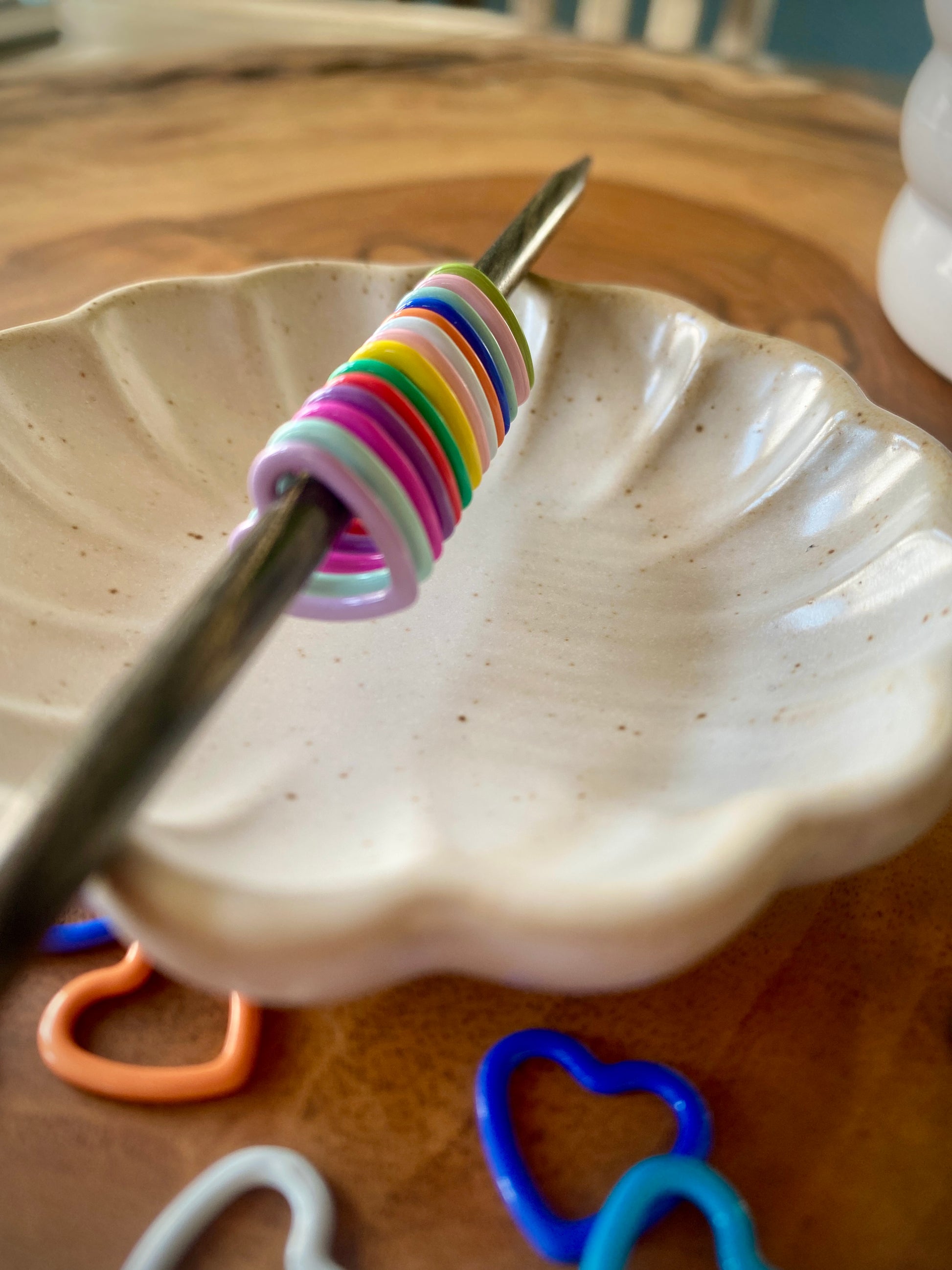 This listing is for a set of 20 multi-colored, heart shaped stitch markers.