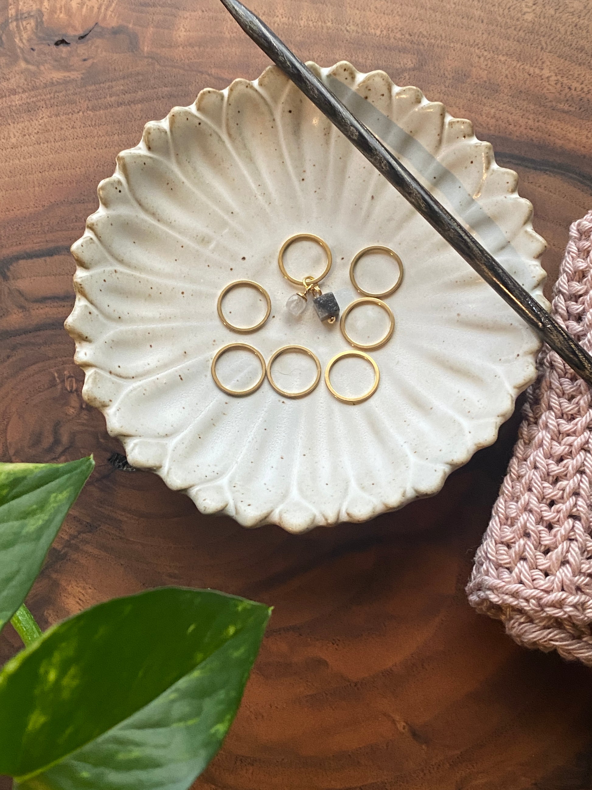 This listing is for a set of 6 round snag free stitch markers. Plus one natural stone dangly Beginning of Round marker